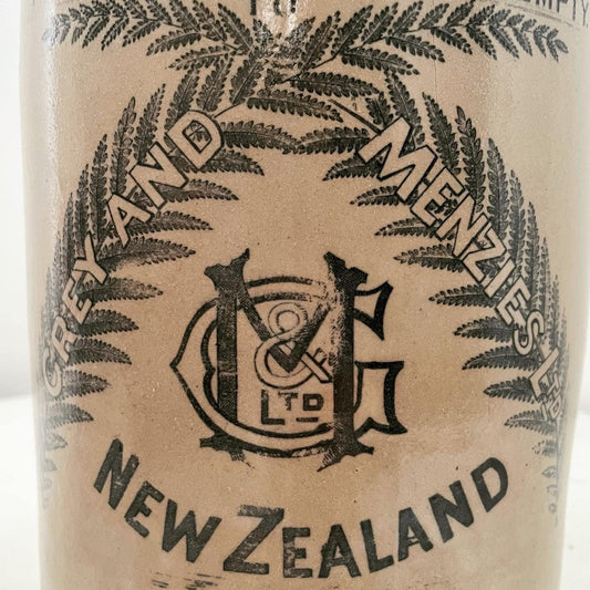 Extra large, antique stonewear jug stamped with New Zealand silver ferns