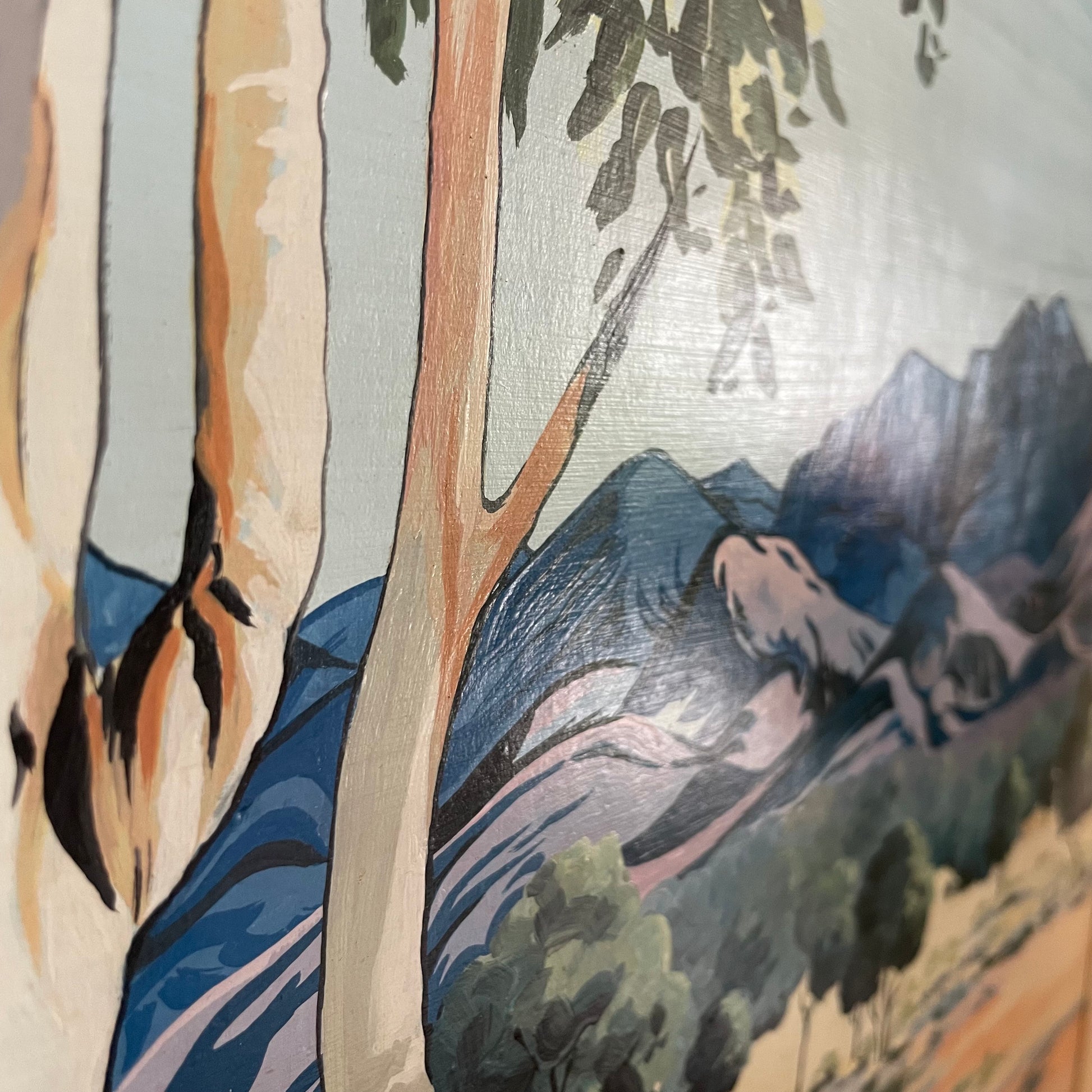 Lovely “study” painting of one of Albert Namatjira‘s works. Namatjira was a famous aboriginal artist from Australia that specialized in blending indigenous and western styles. His signature subjects were the Ghost Gum Eucalyptus trees and the Western MacDonnell Ranged in the Northern Territory of Australia.
