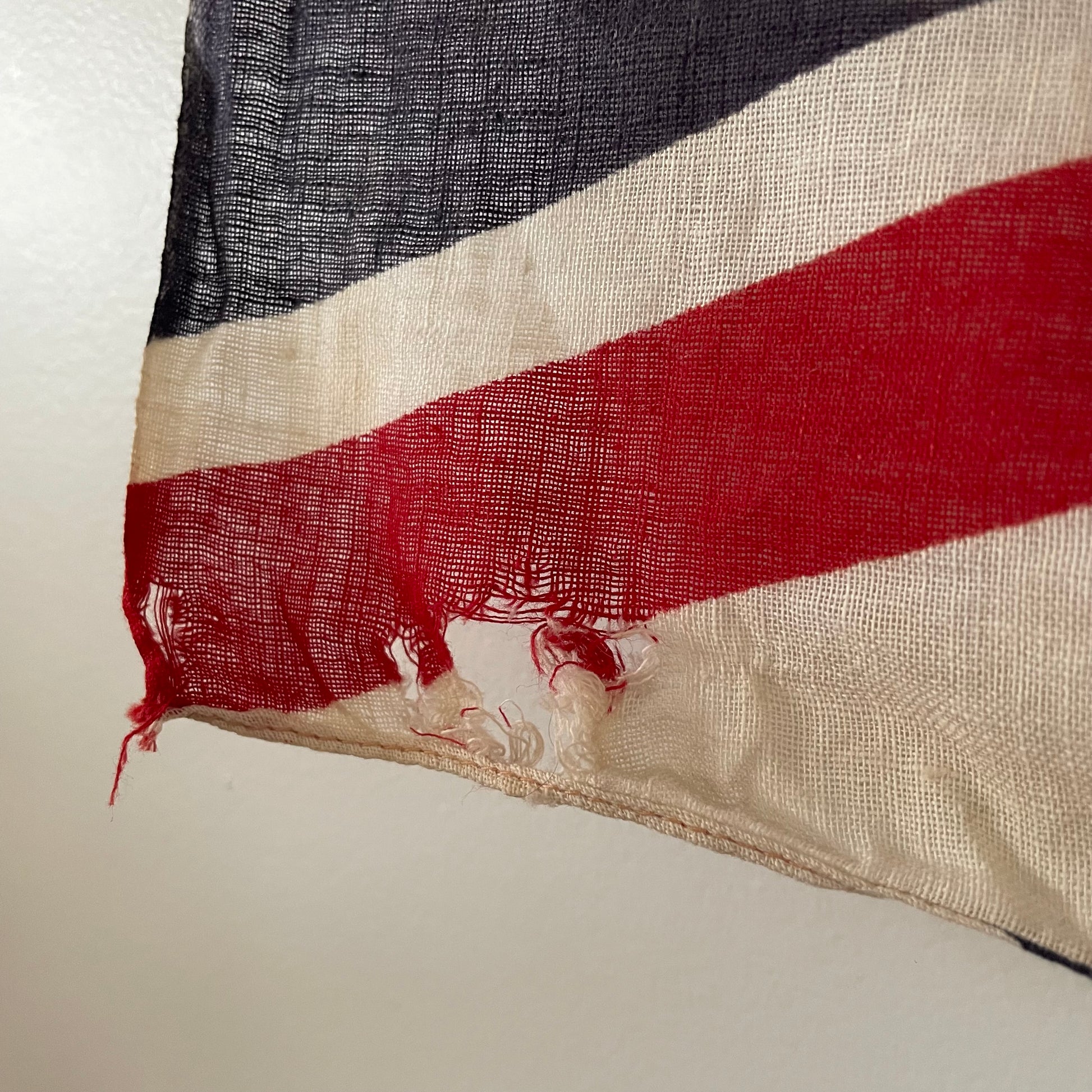 Antique Union Jack flag tattered to perfection. Approximately 33 x 16.5 inches.