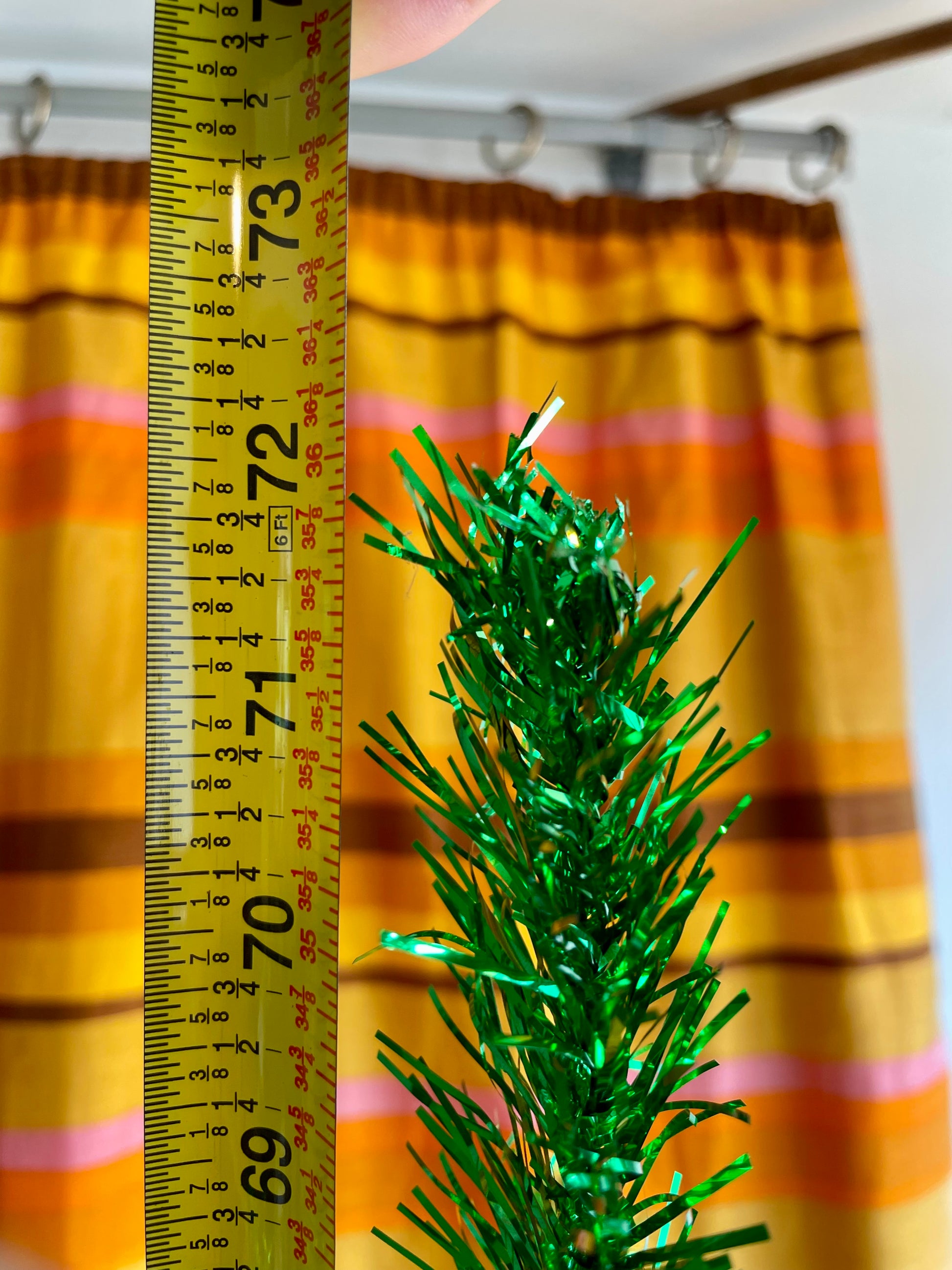 Description: Beautiful, sparkly vintage green Christmas tree. The tree is from New Zealand, most likely from the N.Z. Tinsel Limited Company, which was established in Auckland in 1959. Approx. 72” tall x 28” wide. (in the picture with the tree skirt, I have sitting on a small box which is a great way to give it a little more height if desired)