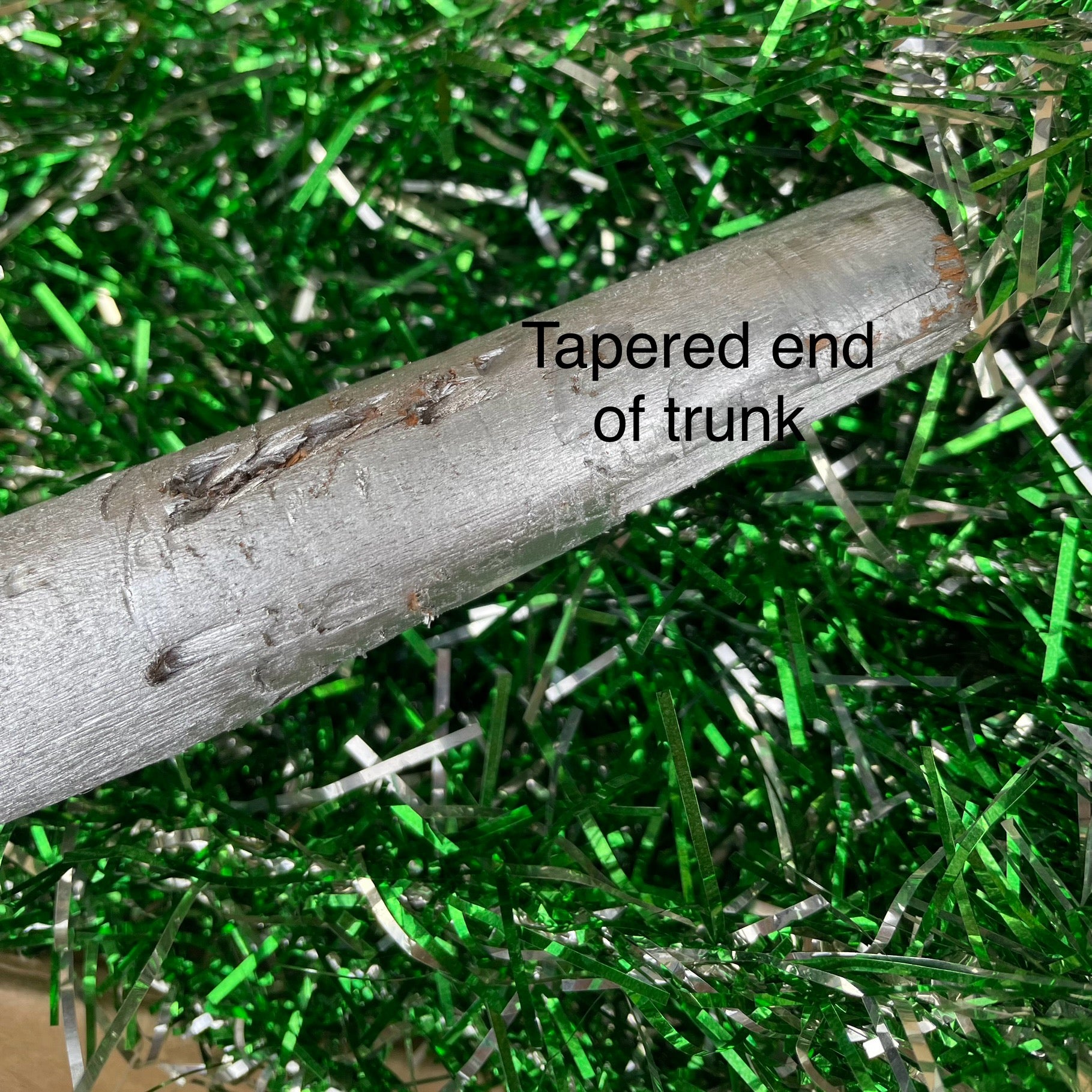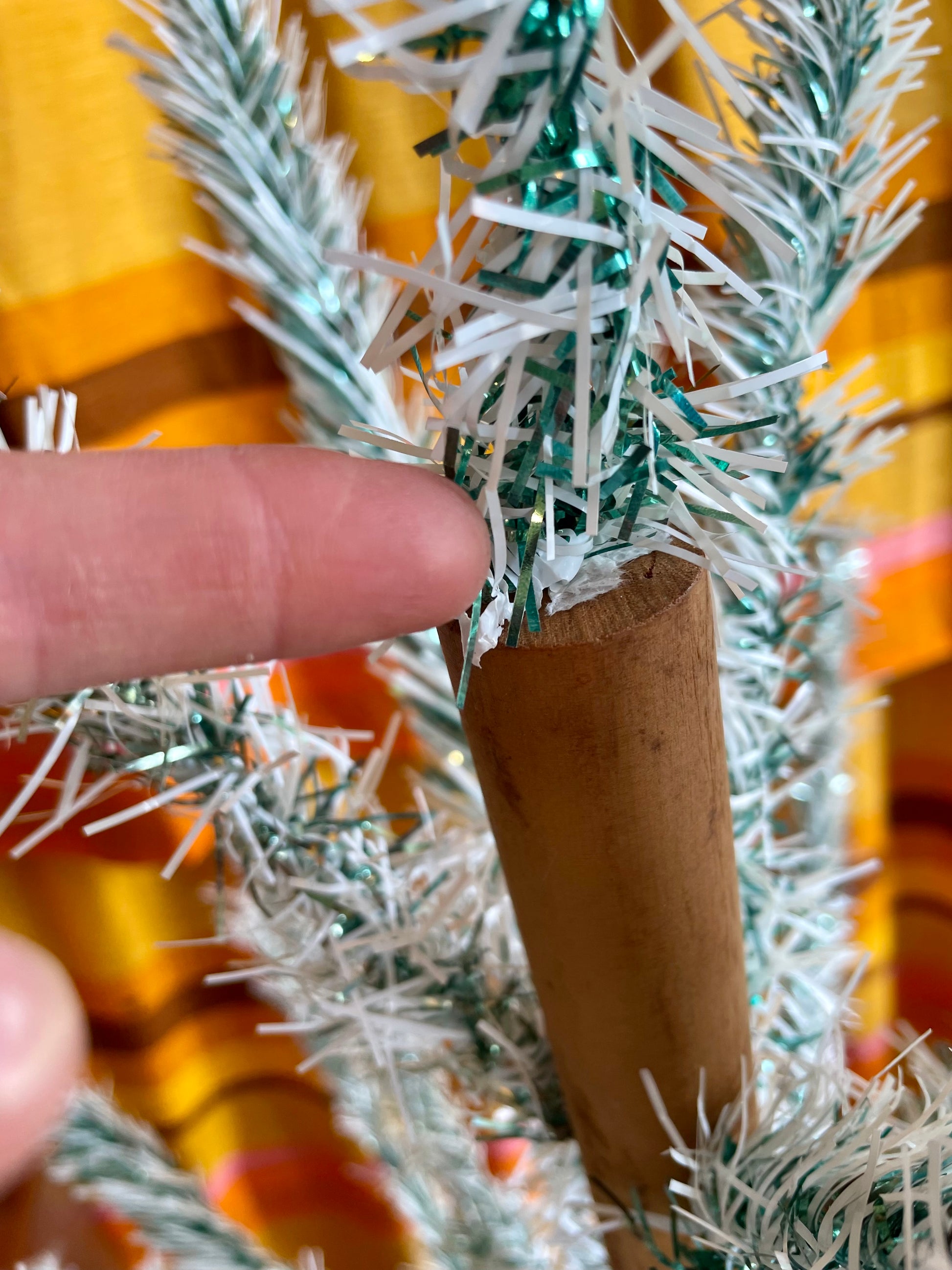 Some of the branches may be snug or slightly loose in the wooden holes, but they all fit! Branches can be molded into the positions desired. Some may be slightly crooked, but can be bent back if needed. Some branches might have the tinsel slightly smushed in patches. Tinsel bits to be expected at the bottom of the box. Tree trunk may lean slightly at first, but the center poles can be rotated until it balances. The wooden poles fit together, but you may have to twist the dowels in if it’s a snug fit (or in the case of it being too loose, you can always place a bit of tissue inside the hole). Please note this is vintage tinsel, not aluminum metal (the stand is aluminum).