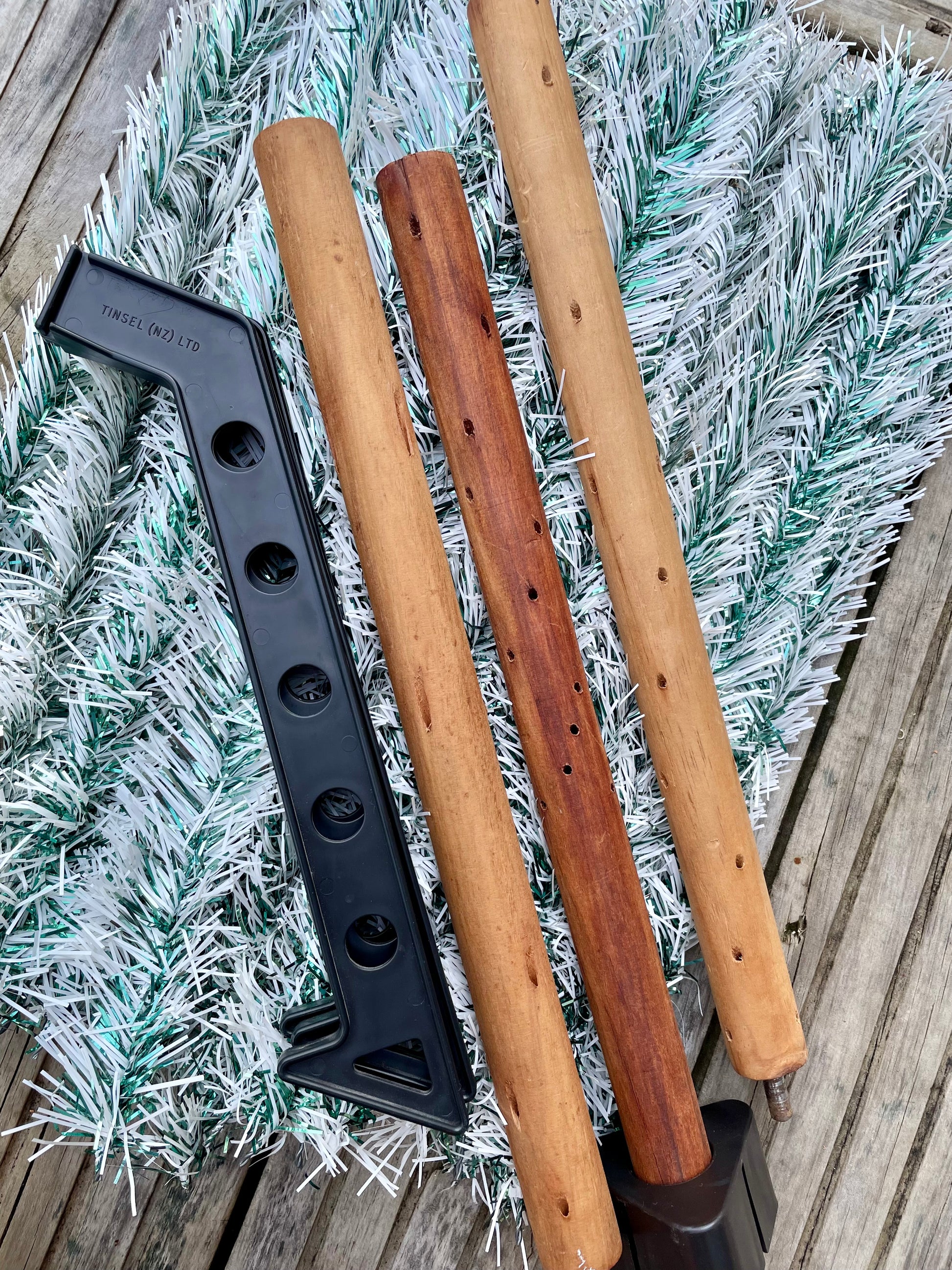 Description: Sparkly authentic mid-century Christmas tree. The tree is most likely from New Zealand from the N.Z. Tinsel Limited Company which was established in Auckland in 1959! The branches are made of dual-colored green and silver tinsel, it has a folding aluminum stand and 3 solid wooden poles for the trunk.