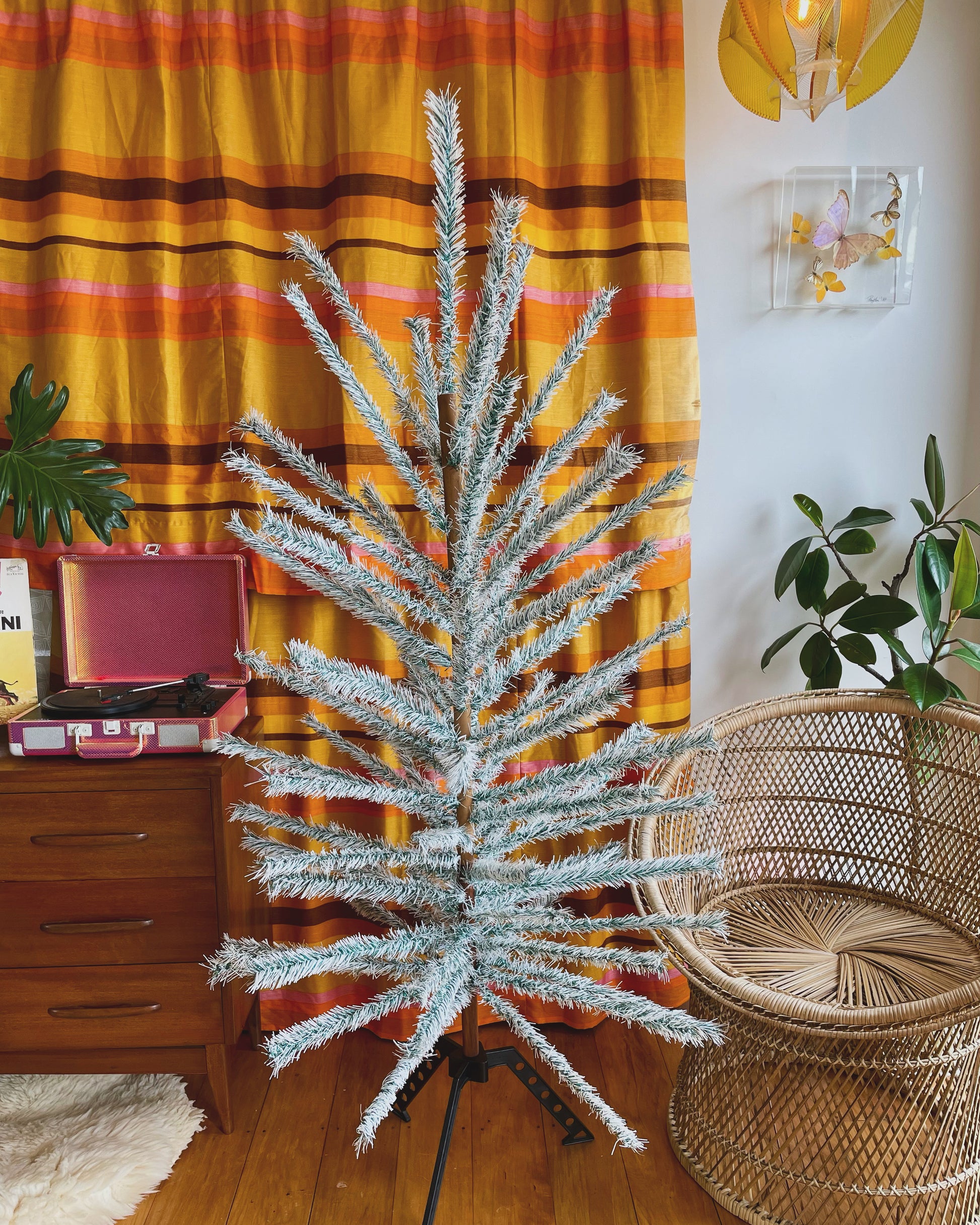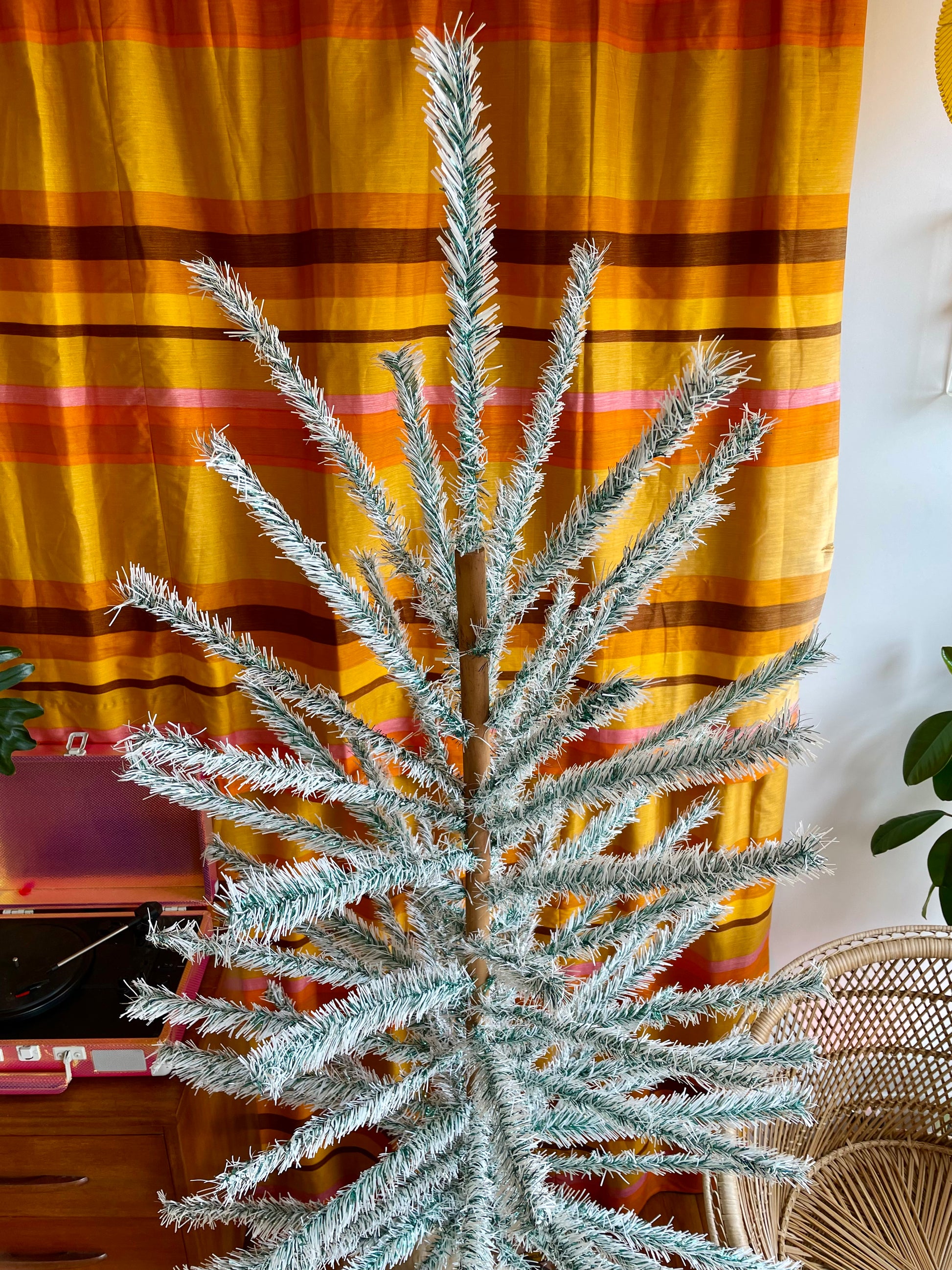 Although the stand is an original midcentury one, I believe the owners replaced it somewhere along the way. The trunk is a little too big for the stand so it looks like it was hand-carved down to a tapered end - pictured. (The 3 pole Christmas trees usually have a taller, larger stand and the 2 pole trees usually have ones like this tree has). Because of this, the fit wasn’t as seamless as my other trees, and I had to rotate the pole to get it in and straight. But after that it was fine and not wobbly.
