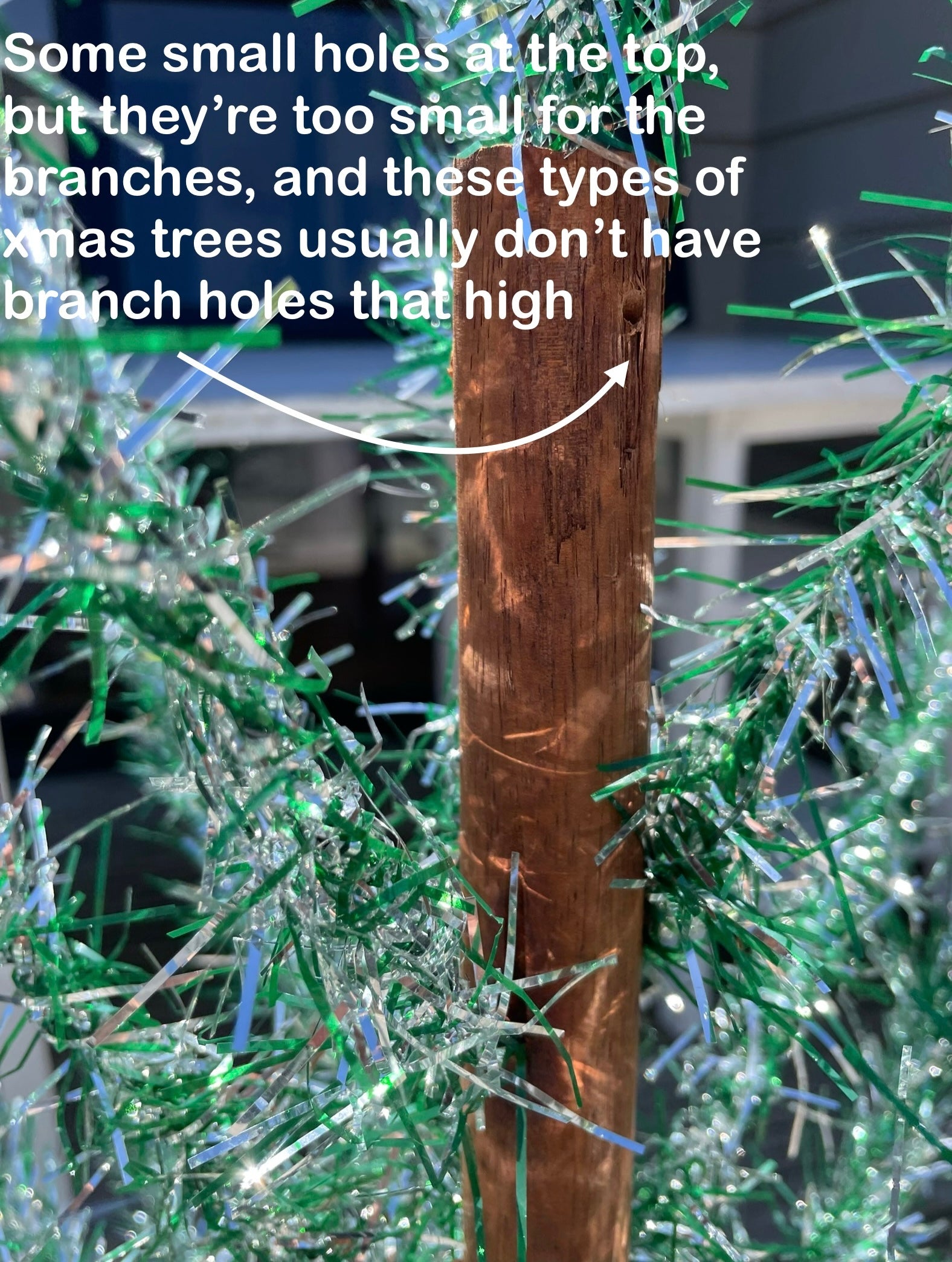 I of course take note of all the imperfections when assembling the trees, but when I was finished with this one, I really did step back and go - “wow! You can hardly tell!” The branches were shedding a bit of tinsel when I assembled it, but nothing alarming. Quite a few of the branches are patchy or have stripped sections where the fanned out tinsel is gone (see picture). There are not enough branches to fill every single hole, and some slots were left empty at the very bottom.