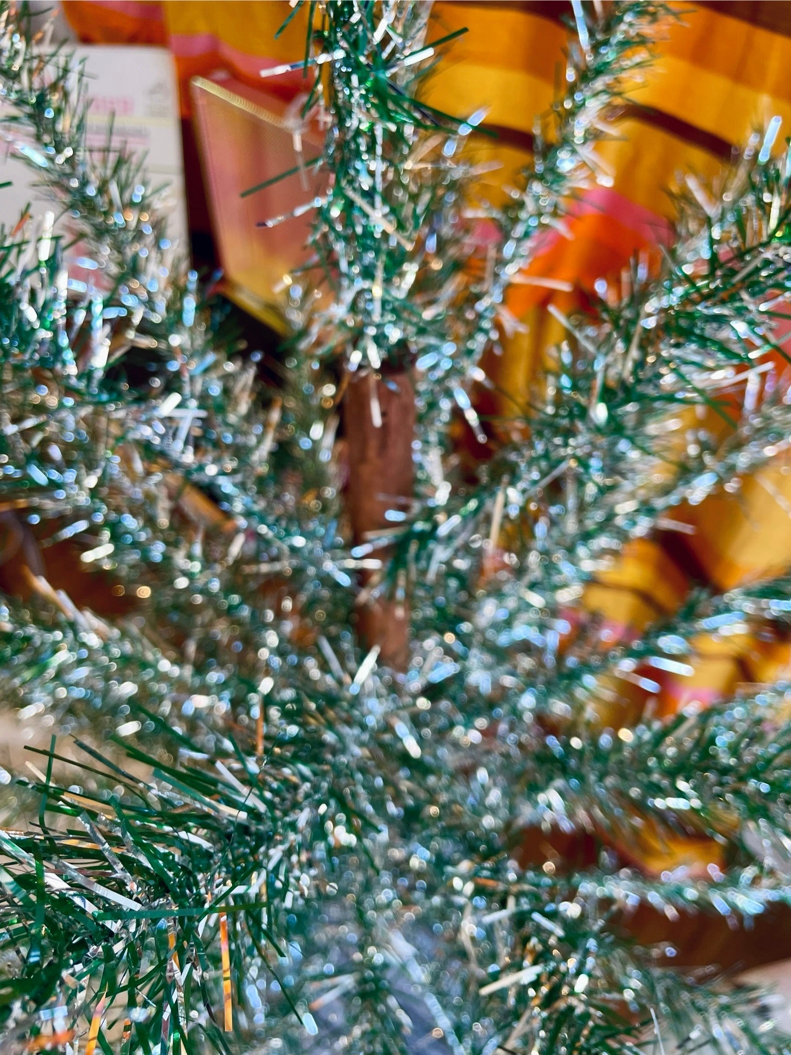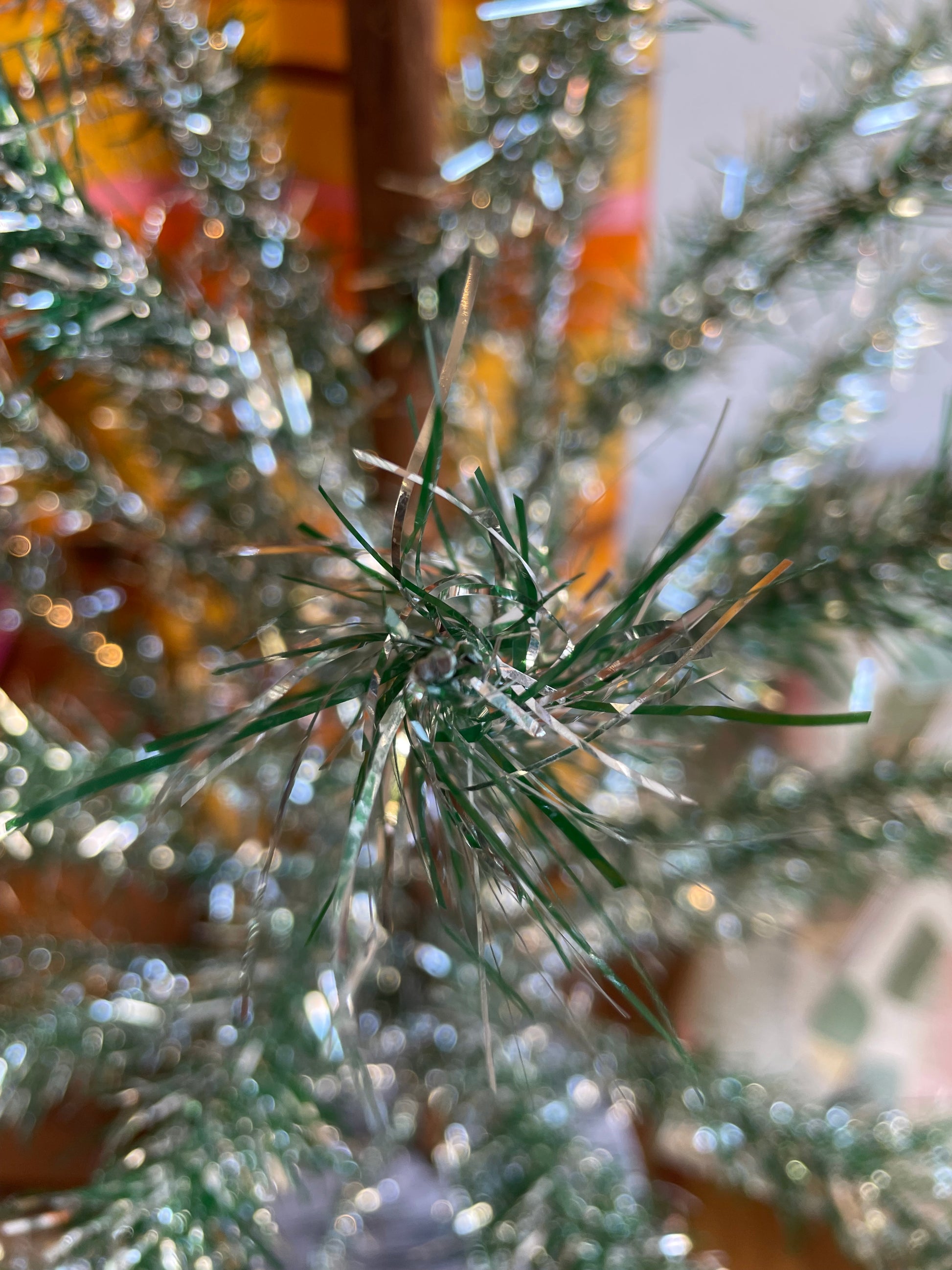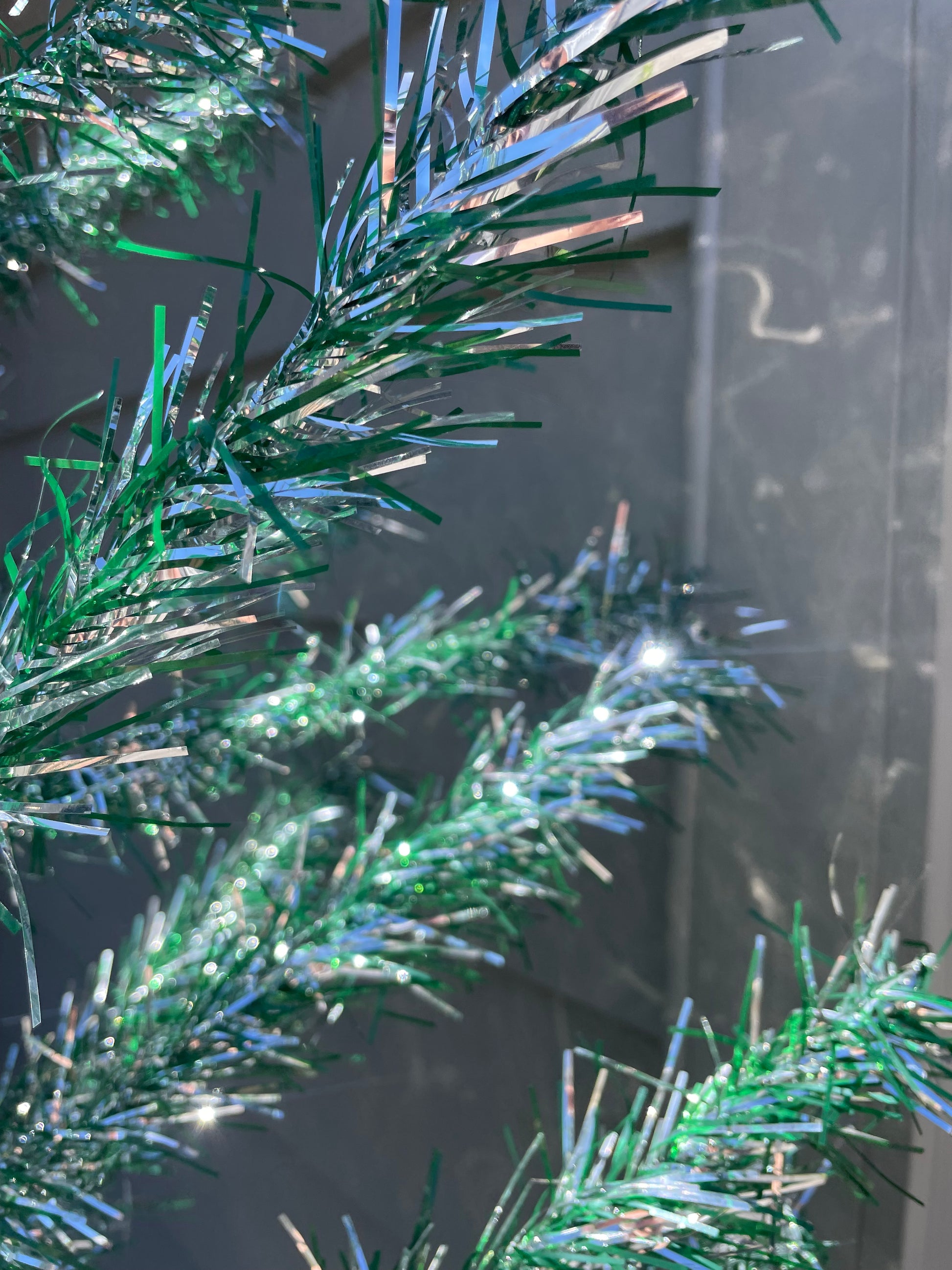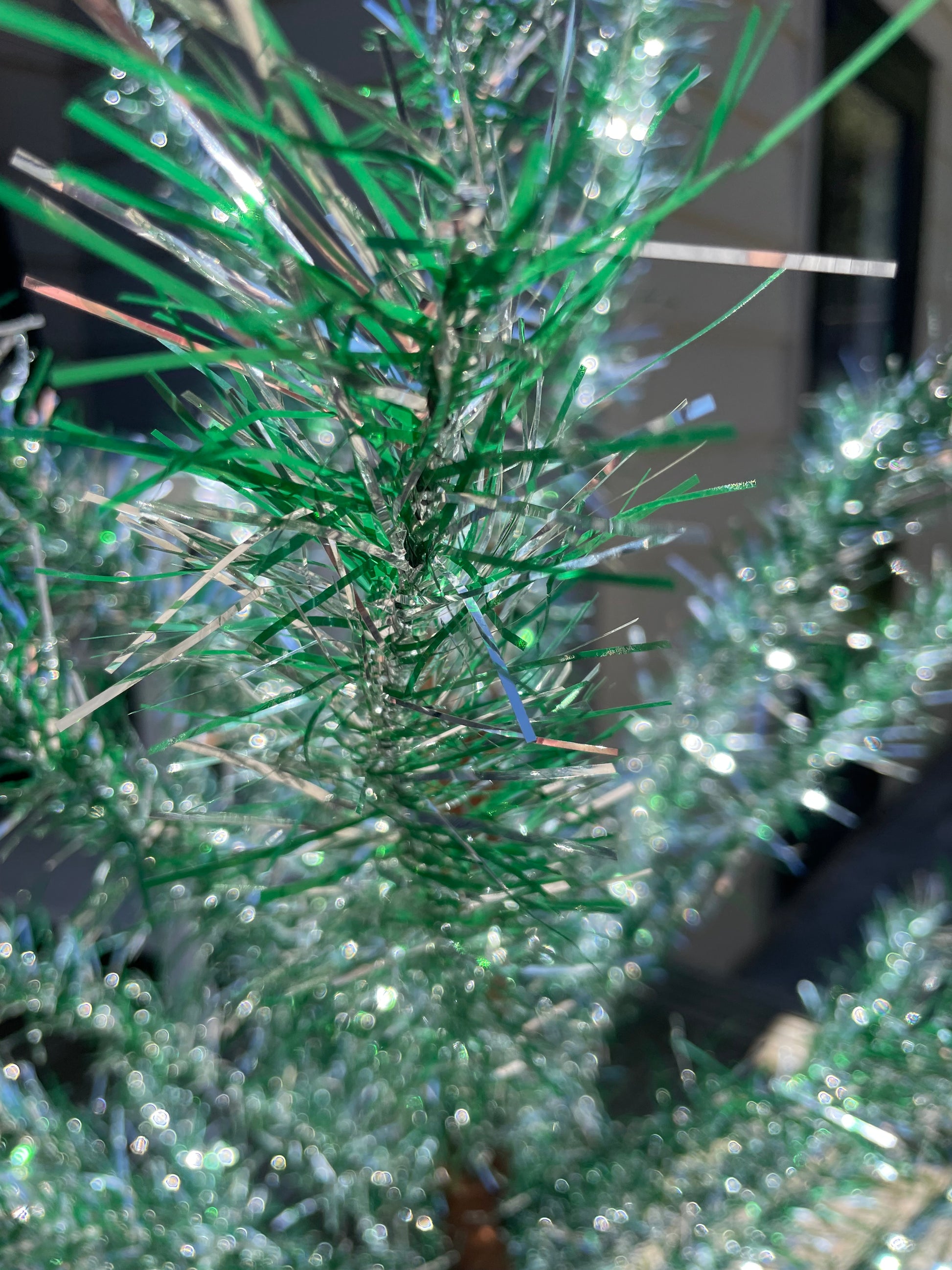 Description: Very sparkly silver and green mid-century modern Christmas tree. The tree is from New Zealand, most likely from the N.Z. Tinsel Limited Company which was established in Auckland in 1959! The branches are made of dual-colored shiny silver and green tinsel. The last few pictures were taken outside, where the green tinsel appeared much lighter in color than the inside pictured. When the sunlight hit the branches, they were so reflective and shiny!