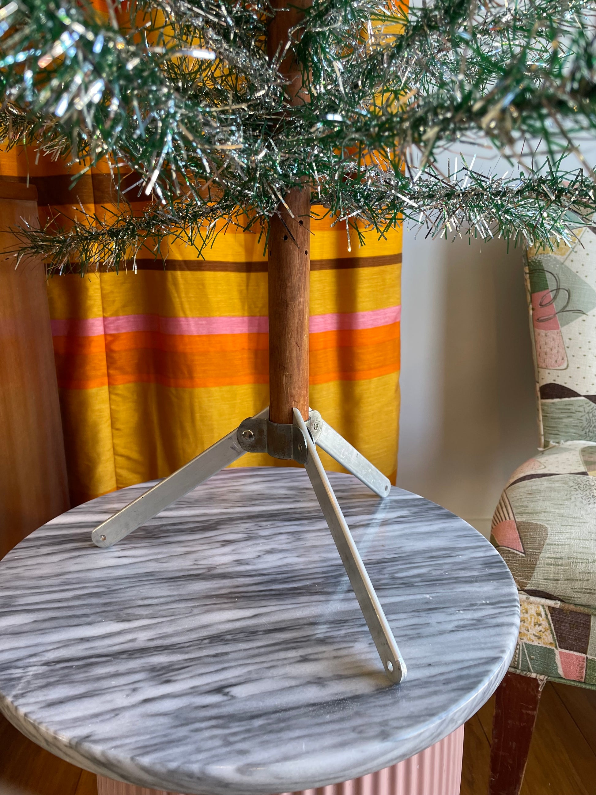 Some of the branches may be snug or slightly loose in the wooden holes, but they all fit! Branches can be molded into the positions desired. Some may be slightly crooked, but can be bent back if needed. Some branches might have the tinsel slightly smushed in patches. Tinsel bits to be expected at the bottom of the box. Tree trunk may lean slightly at first, but the center poles can be rotated until it balances. The wooden poles fit together, but you may have to twist the dowels in if it’s a snug fit (or in the case of it being too loose, you can always place a bit of tissue inside the hole). The stand was a little snug, but it fits on! Please note this is vintage tinsel, not aluminum metal (the stand is aluminum).