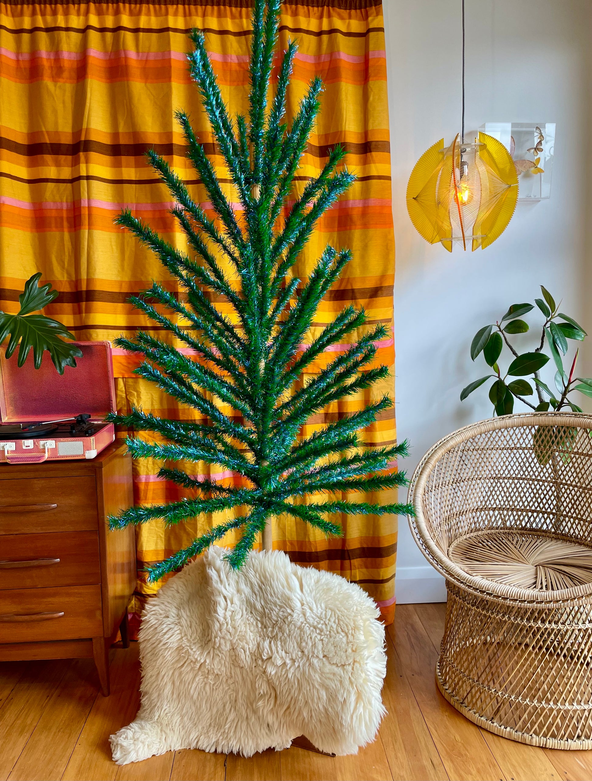 Description: Beautiful sparkly vintage green and blue Christmas tree. The tree is from New Zealand, most likely from the N.Z. Tinsel Limited Company.