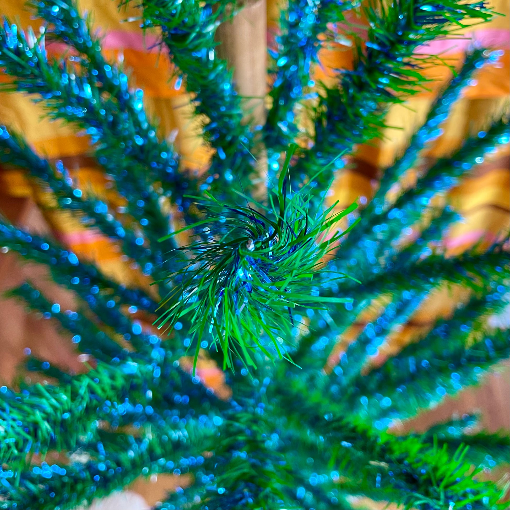 Sparkly vintage blue and green faux Christmas tree - midcentury modern peacock Xmas tree