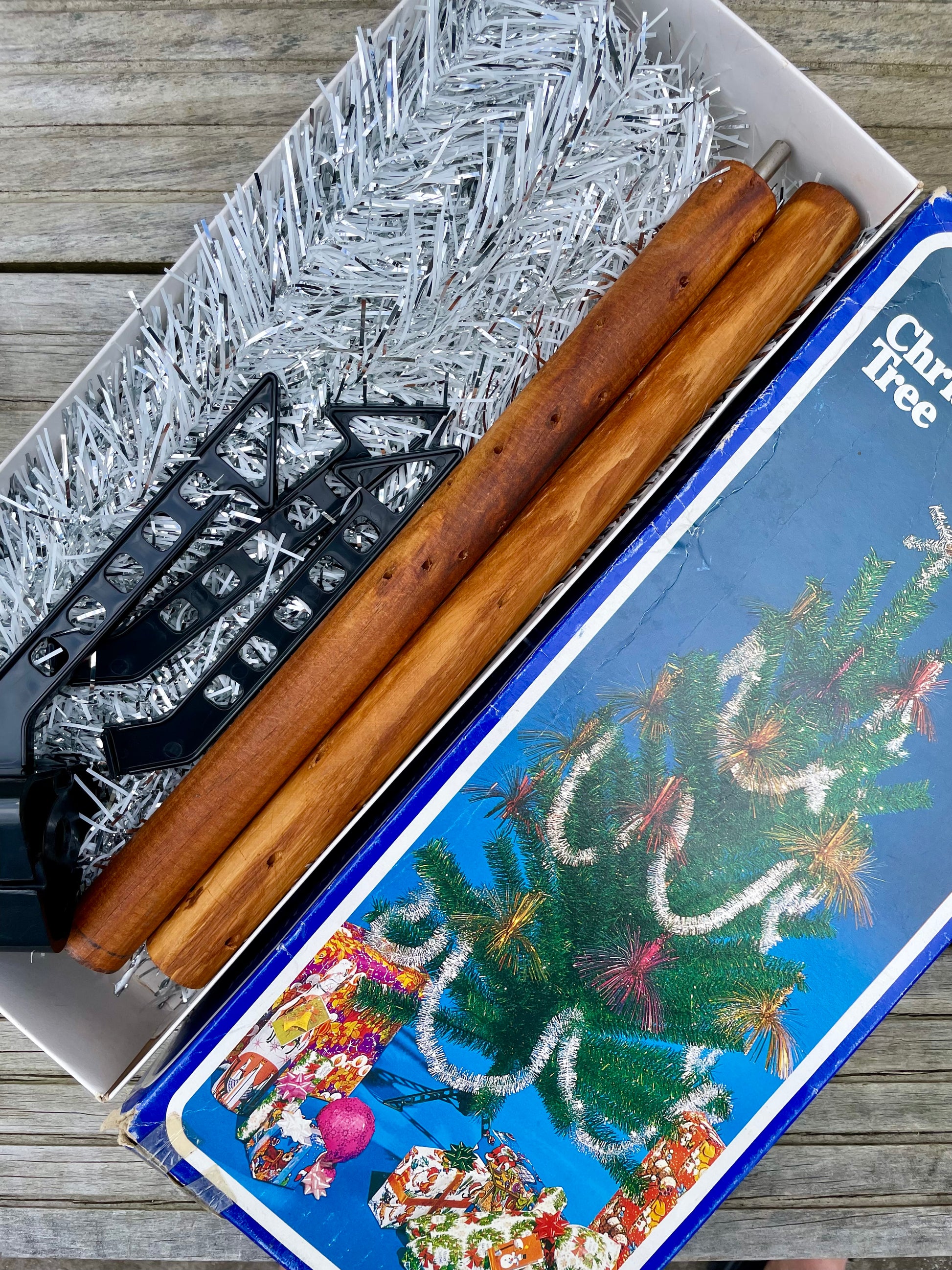 Condition: Overall good vintage condition. Some of the branches may be snug or slightly loose in the wooden holes, but they all fit! Branches can me molded into the positions desired. Some may be slightly crooked, but can be bent back if needed. Some branches might have the tinsel slightly smushed in patches. Tinsel bits to be expected at the bottom of the box. Tree trunk may lean slightly at first, but the center poles can be rotated until it balances. The wooden poles fit together, but you have to twist the metal dowels in as its a snug fit. Please note this is vintage tinsel, not aluminum metal.
