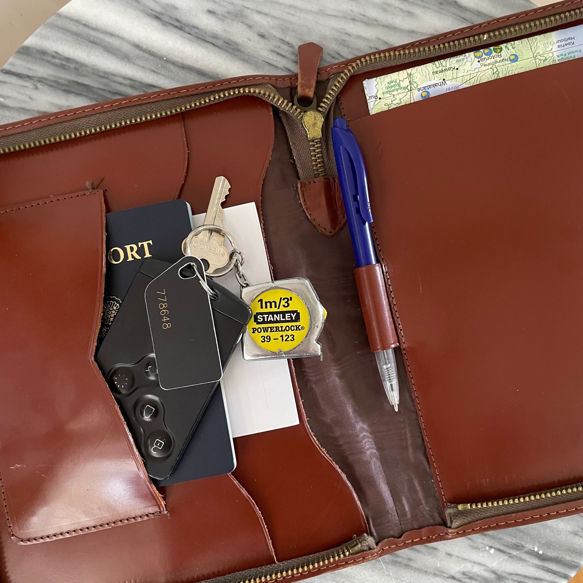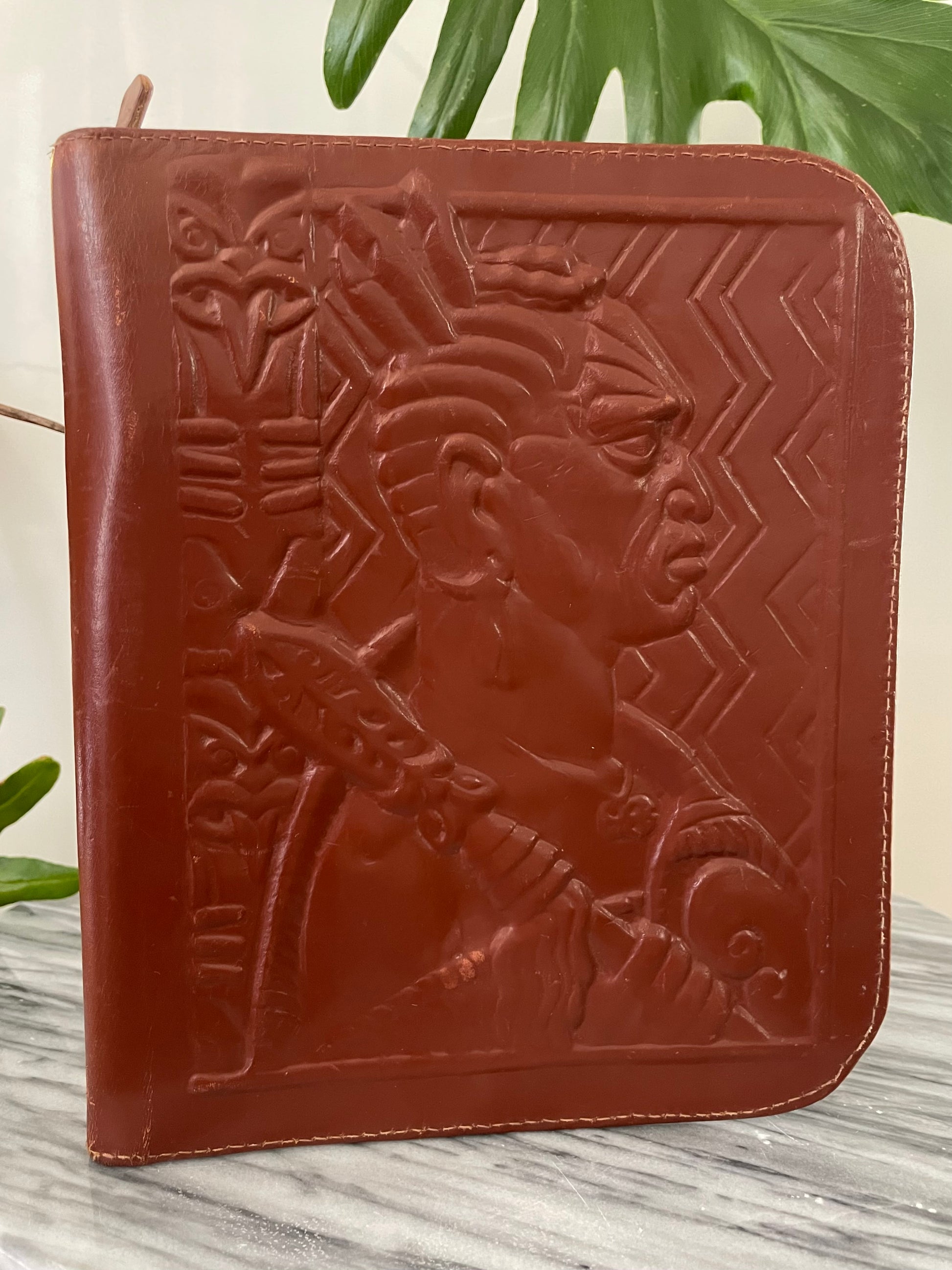 Vintage leather zip-up clutch/writing case embossed with a Māori rangatira (chief) from Aotearoa, New Zealand.
